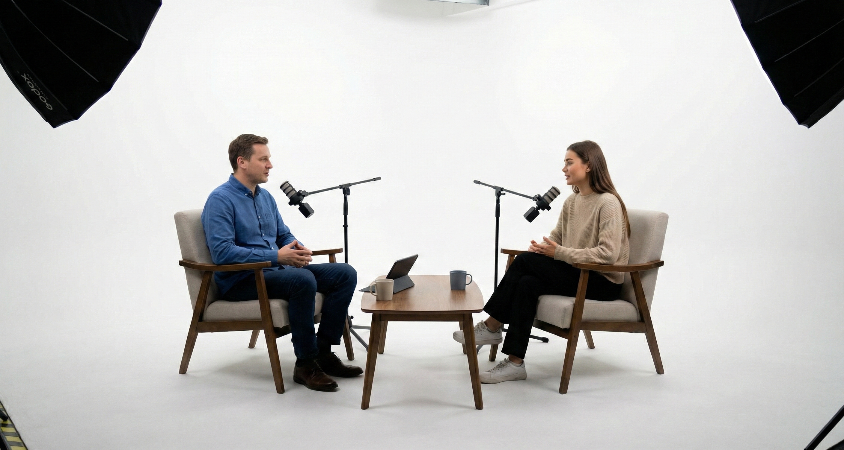 Клиент звонит в студию и говорит: «Нам нужно записать подкаст с гендиректором». Начинаем разбираться, и выясняется, что нужен строгий белый фон, два кресла, петлички-невидимки и жесткий сценарий «вопрос-ответ». То есть классическое телевизионное интервью.